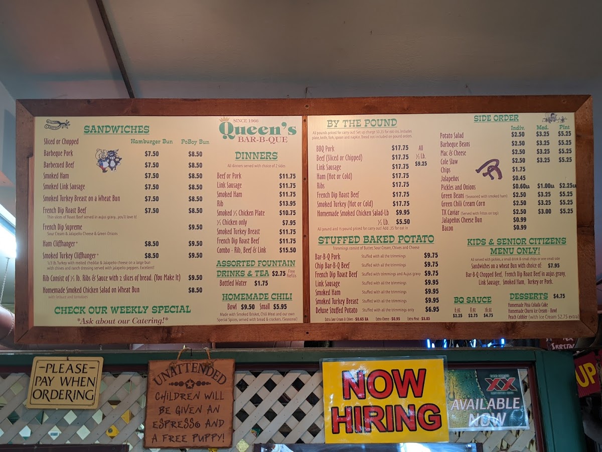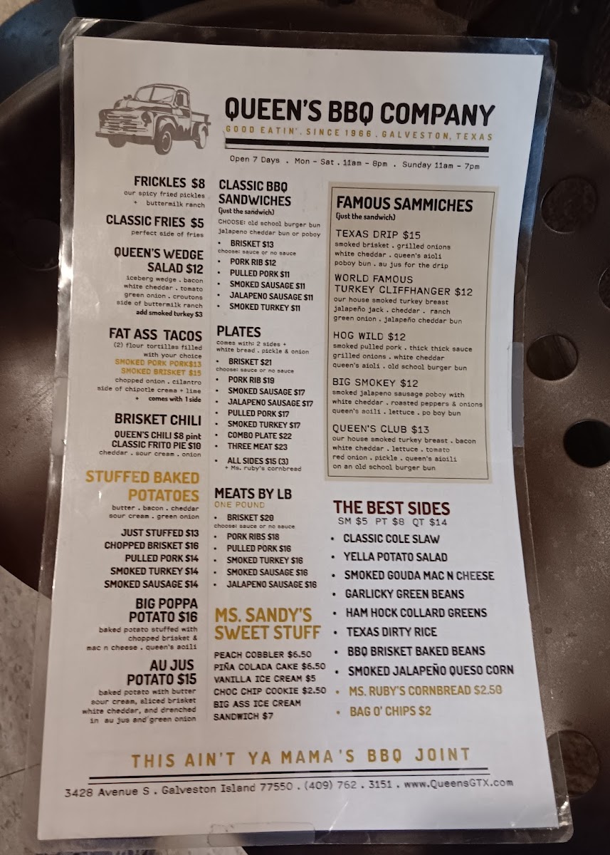 Welcome to Queen's Bar-B-Que, a hidden gem in Galveston, TX, that captures the essence of authentic Texas barbecue. Here, every dish celebrates the smoky flavor and rich textures that barbecue lovers crave. The menu offers a variety of mouth-watering sandwiches, such as the succulent Turkey Cliffhanger and Chopped Brisket, each meticulously prepared to deliver satisfying portions at great prices.